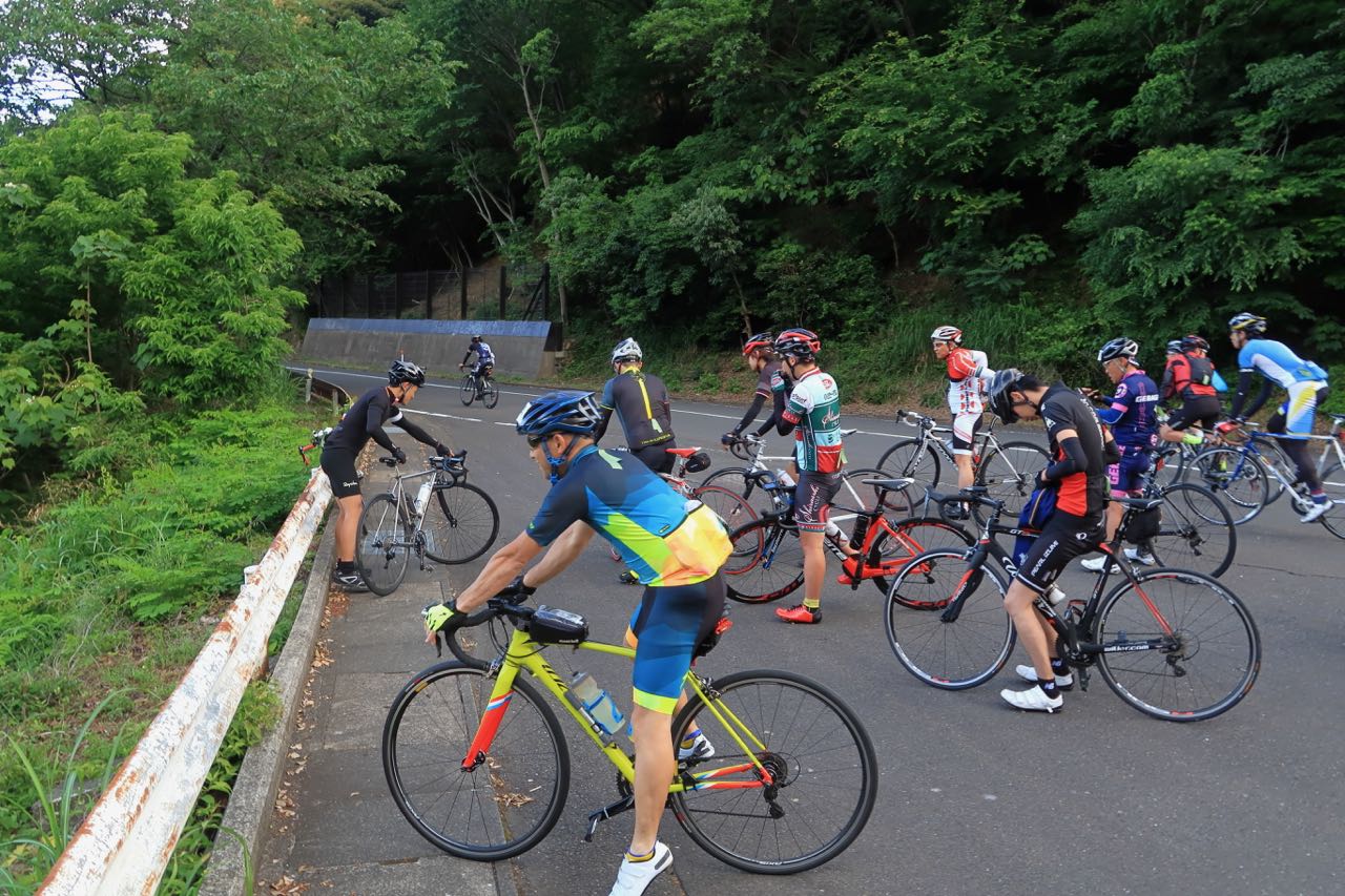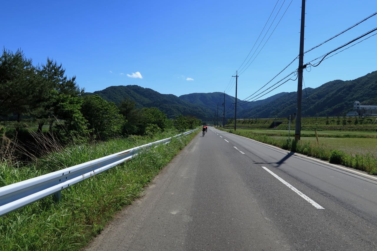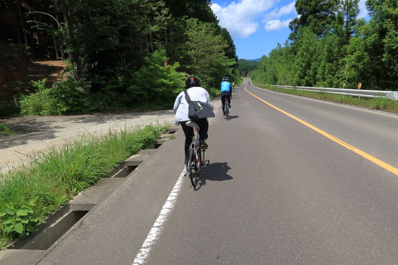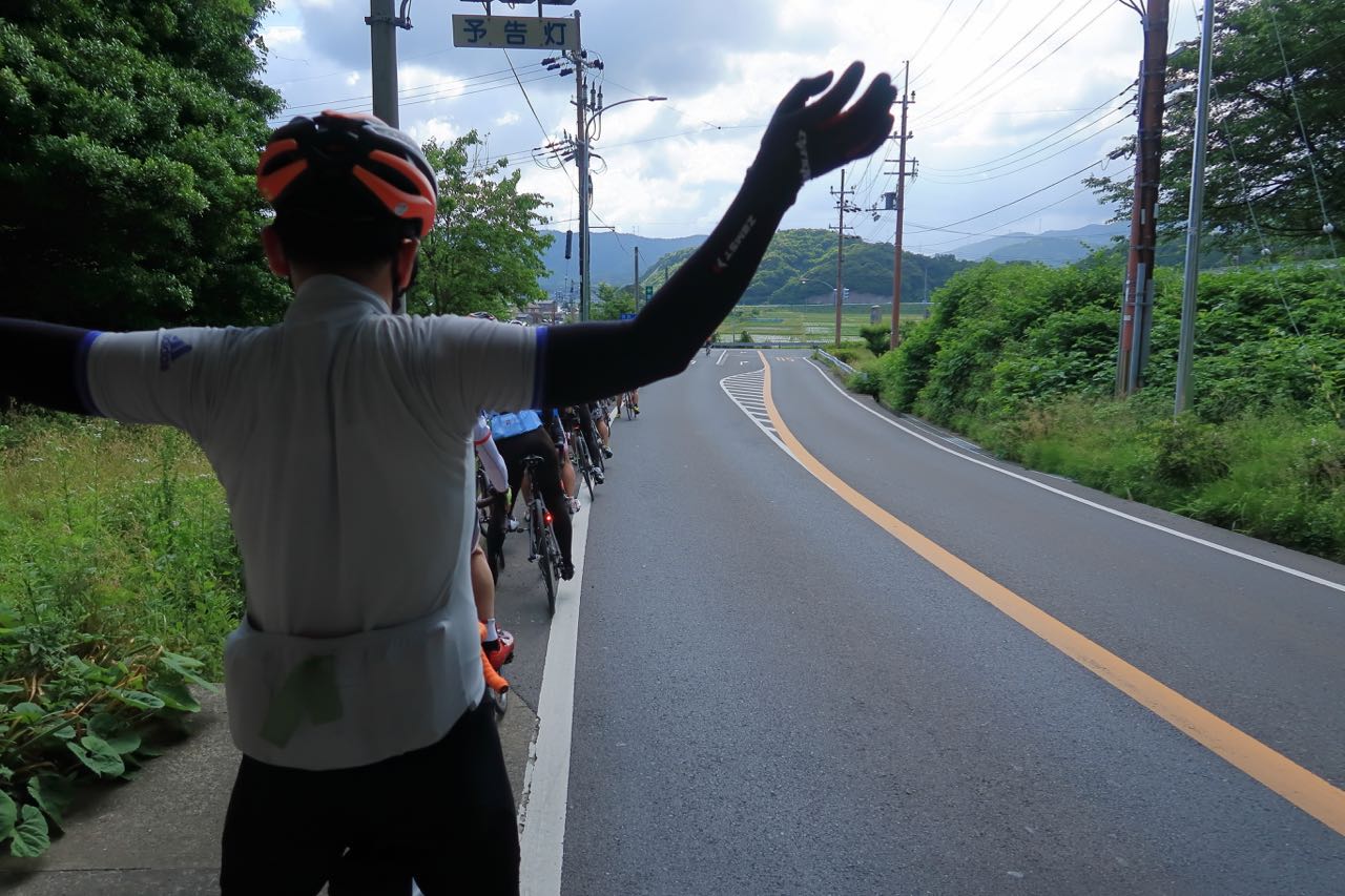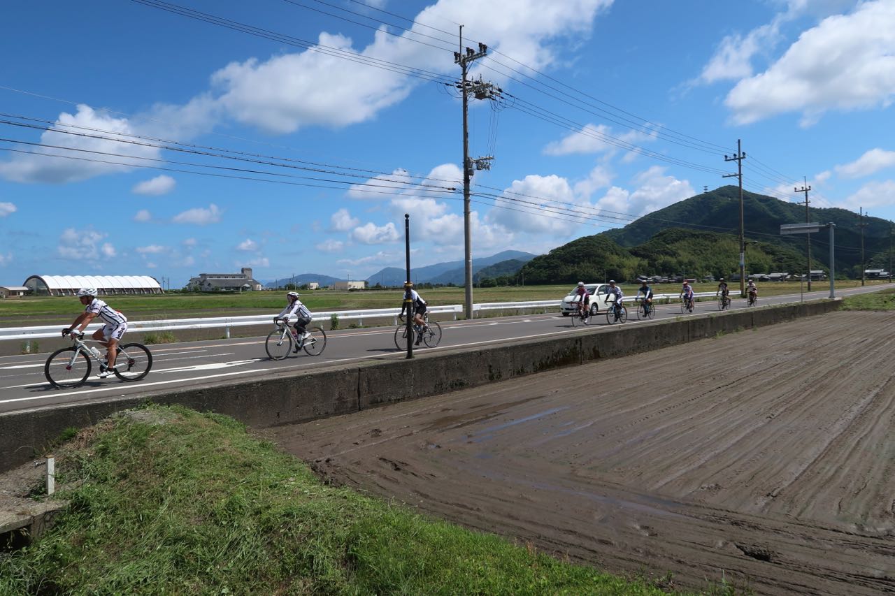 しばらくは平坦路が続く。人が多い。10人弱でチーム参加している人たちのトレインについてゆくが、仲間内で喋りながら並走している人たちなので、注意力散漫な感じがして、ちょっと怖い (交通規制してないところだから…)。一人で飛び出すのはしんどいので、彼らを抜こうとする人が現れるのを待って、その後を追うことにした。