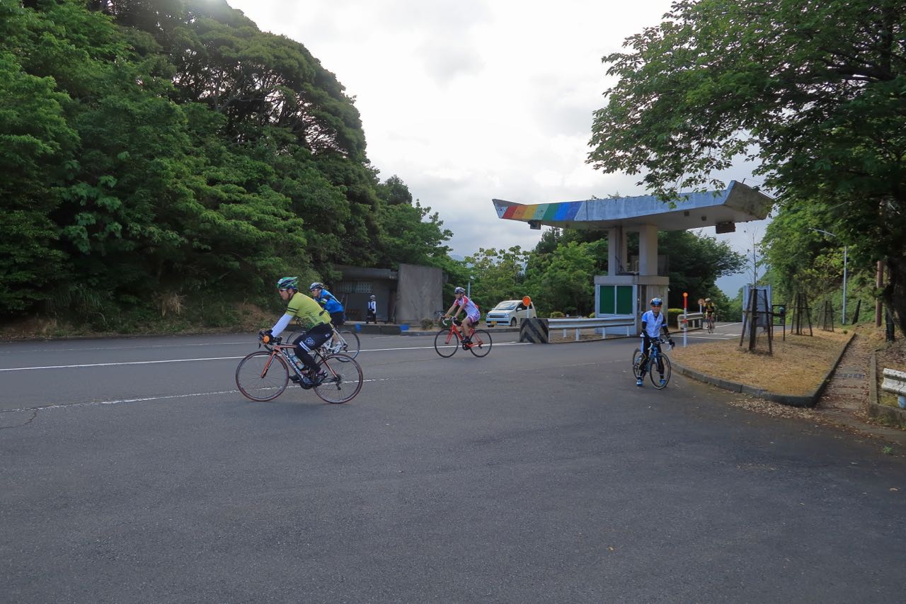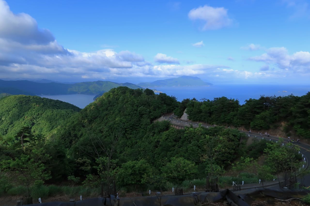 下調べをしてない (勘違いをしてたから) ので、どれだけ上るのかわからない。休むダンシングを織り交ぜながら、淡々と上るものの、なかなかしんどい。「あれ? 申し込んだのは、ヒルクライムイベントだったっけ? (><)」などと思いながら、ペダルを回し続ける。前方上部の展望スペースらしきところに人だかりが見えた。給水ポイントだ。