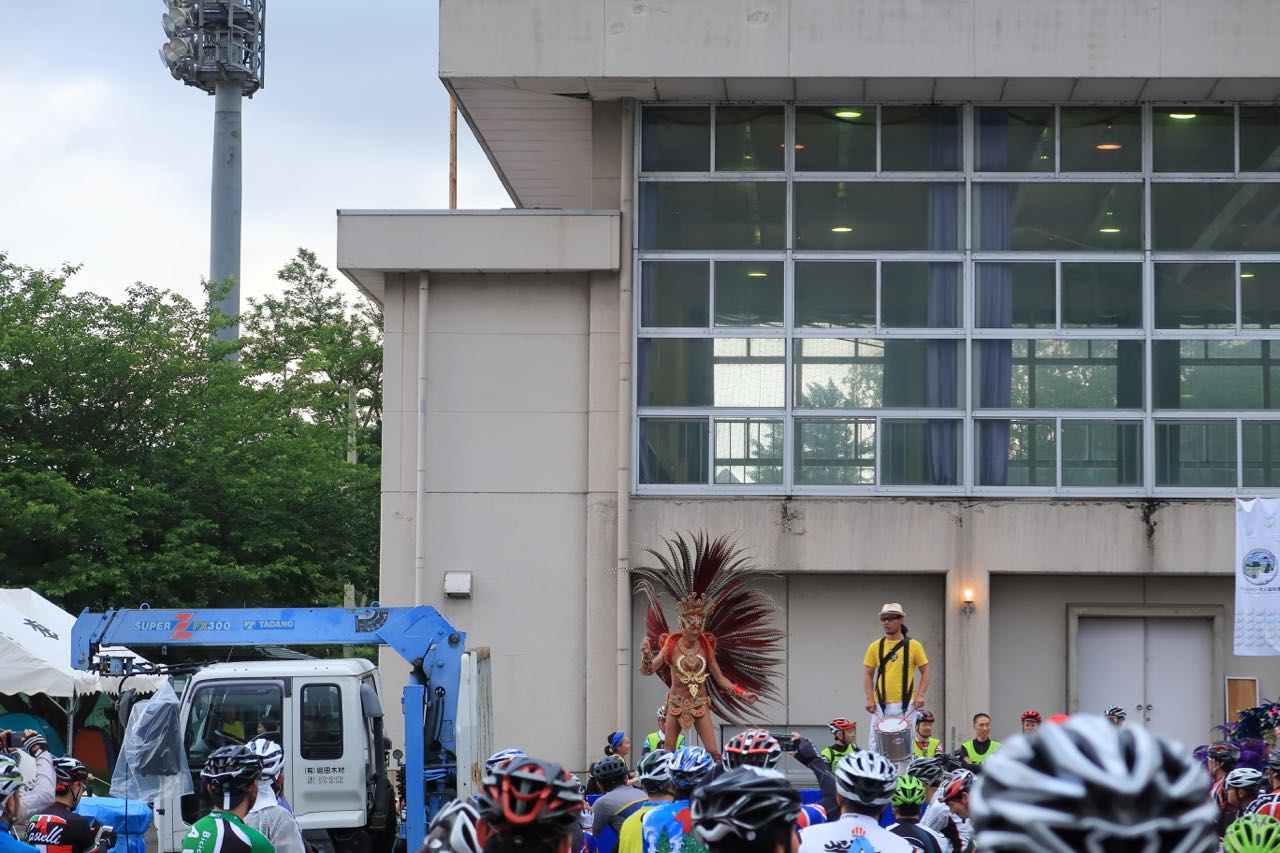 スタートが近づいた。綺麗なお姉さん (?) もサンバを踊る。きっと、地域のサンバ同好会の類なのだろう。まあ、お祭りってことで。 ^^;