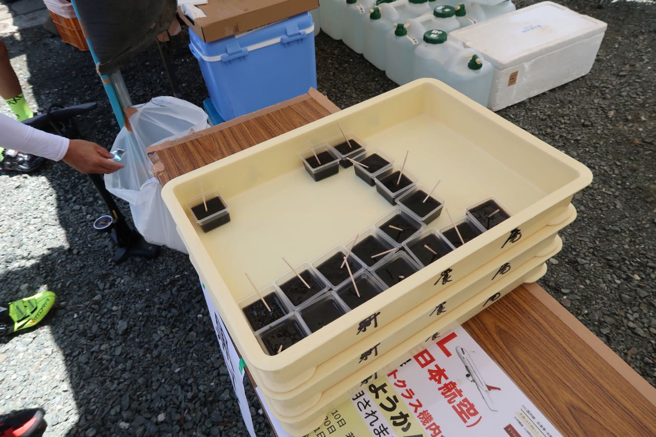 自転車を降りてテントに向かうと、給水しかない。食べ物がないのだ。今まで参加したイベントと勝手が違う。朝は軽くサンドイッチをつまんだだけだし、手持ちの補給食は羊羹が少しあるだけ。「むむ…。体力が持つかなぁ〜?」とちょっと不安が頭を過ぎるが、次のエイドに期待することにした。