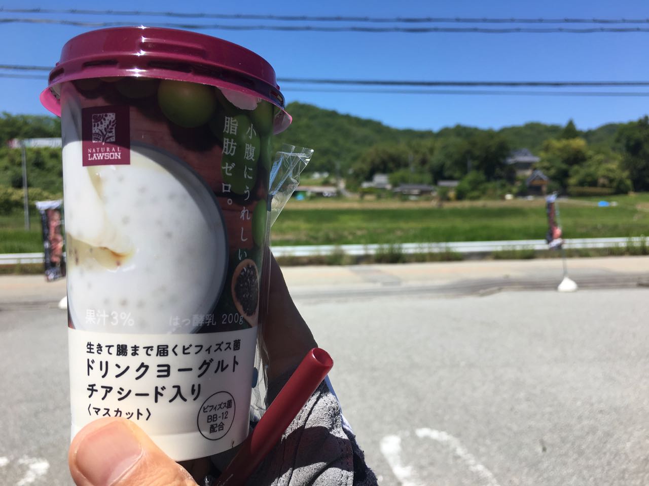 くろまんぷを超えて、下ったところの近くにあるローソンで休憩。今回は距離も短いし、あとは下り基調をのんびり帰るだけなので、エネルギー補給より、ダイエット重視のチアシード入りヨーグルトで。 ^^;