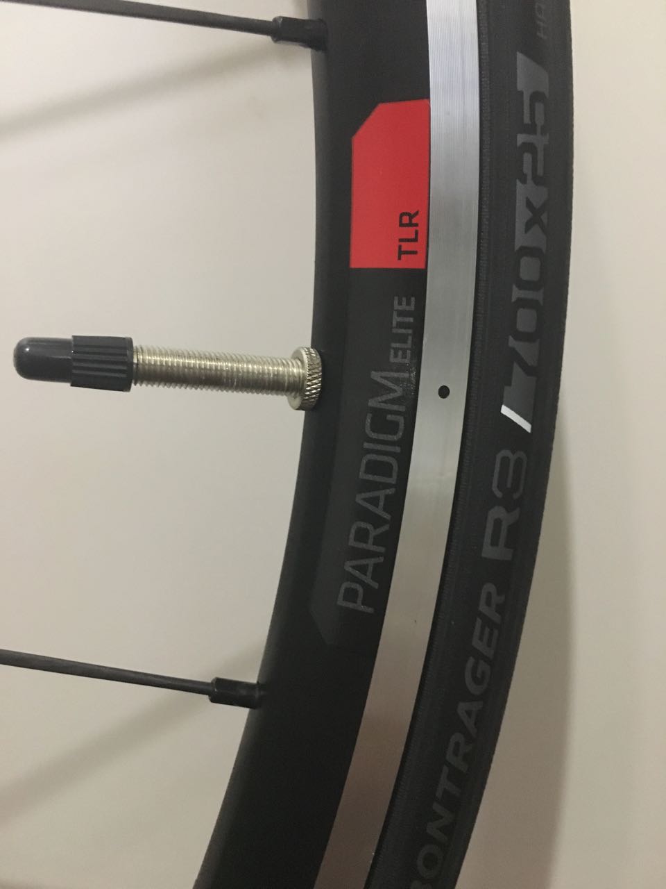 選んだホイールは、 Bontrager のアルミホイールで最軽量となる Paradigm Elite だ。ショップの人には、カンパニョーロやフラクラム、 Shimano の DURA-ACE なんかも紹介されたのだが、ハブのラチェット音が静かな方が好みなので、 Paradigm Elite に決めた (Bontrager 以外は、海外通販の方が安く買えるので、ショップで買う気にならなかった…というのもある ^^;)。