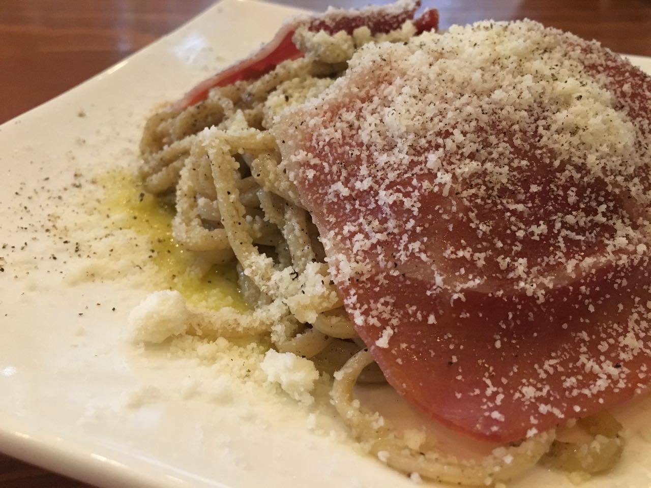 メインのカチョエペペ。これまた絶品!! 手加減抜きでどーんとのってる生ハム。たっぷりかかったペコリーノチーズ。テーブルに運ばれてくると、巨大なペッパーミルを使って、仕上げに目の前で香り高い胡椒を振りまいてくれる。