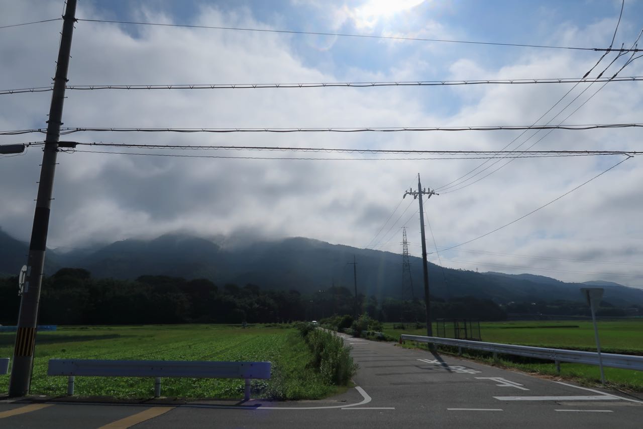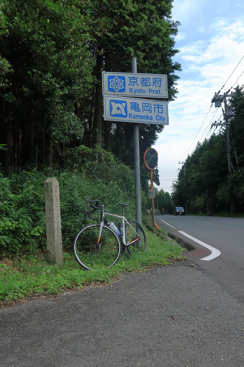 亀岡市街へ向かい、そこからさらに北上。山の上の方に雲がかかっている。たぶん、あの辺りを走るハズなんだけど、ガスってないだろうか?