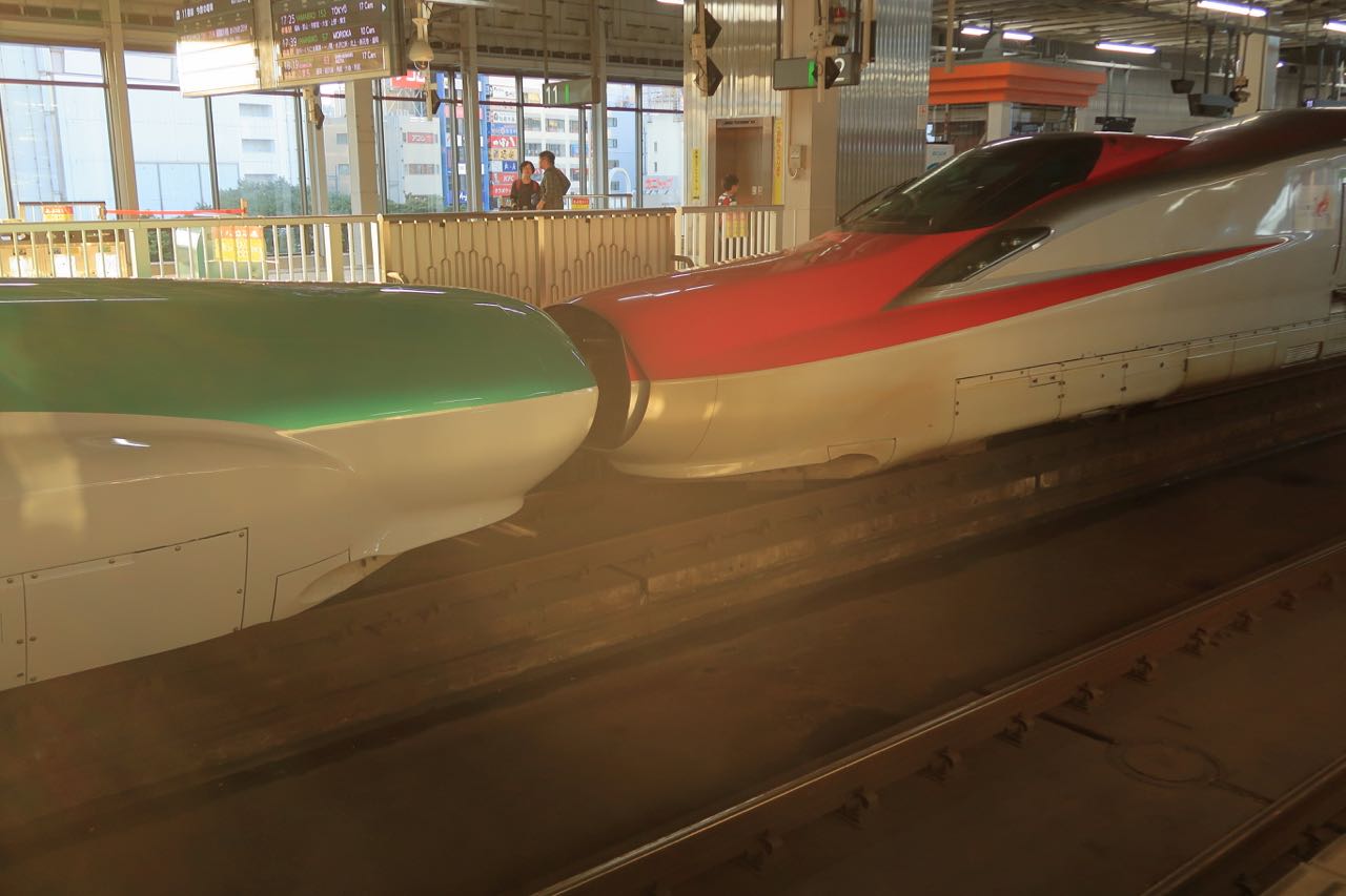 お土産を買ってホームに着くと、新幹線のドッキングシーンが見られた。珍しいのでパシャり。