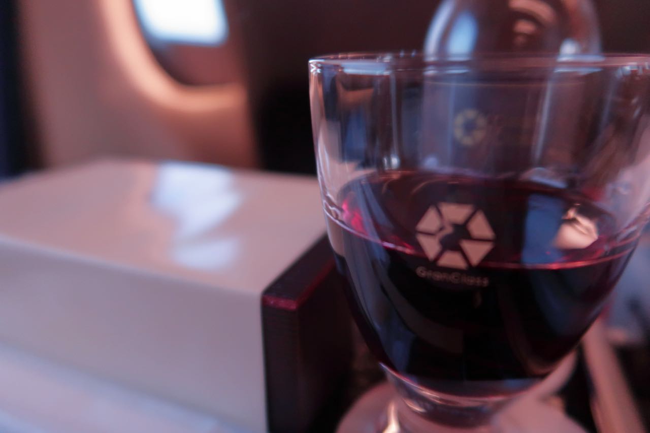 赤ワインは、プラカップぢゃなく、グランクラスのシンボル入りグラスで提供される。