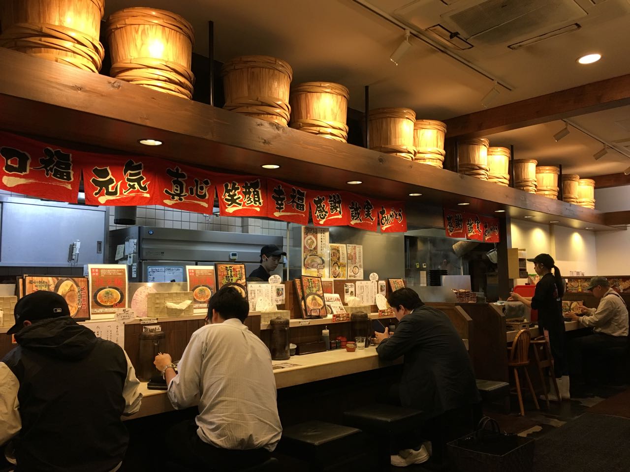 カウンター席の上に味噌樽が並んでる。味噌へのこだわりを表現しているのだろう。