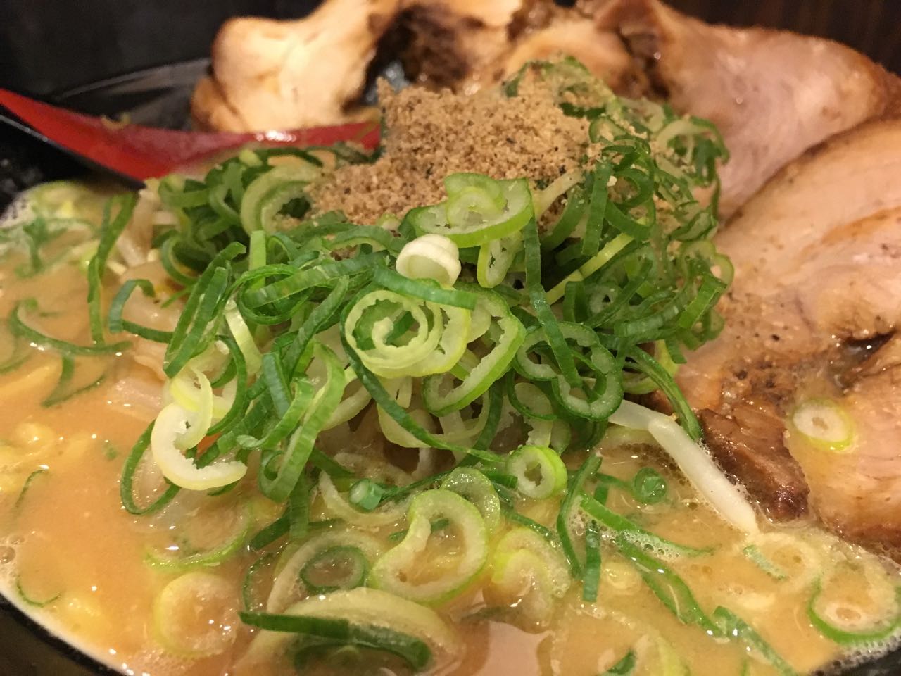 ゴマと味噌のスープは、もちろん美味しいんだけど、驚いたのはチャーシュー。厚めに切られたチャーシューを口に入れると、ホロッとトロける。思い返せば、メニューにも トロチャーシュー って書いてあったかもしれない。これは、病みつきになるかも…。 ^^;
