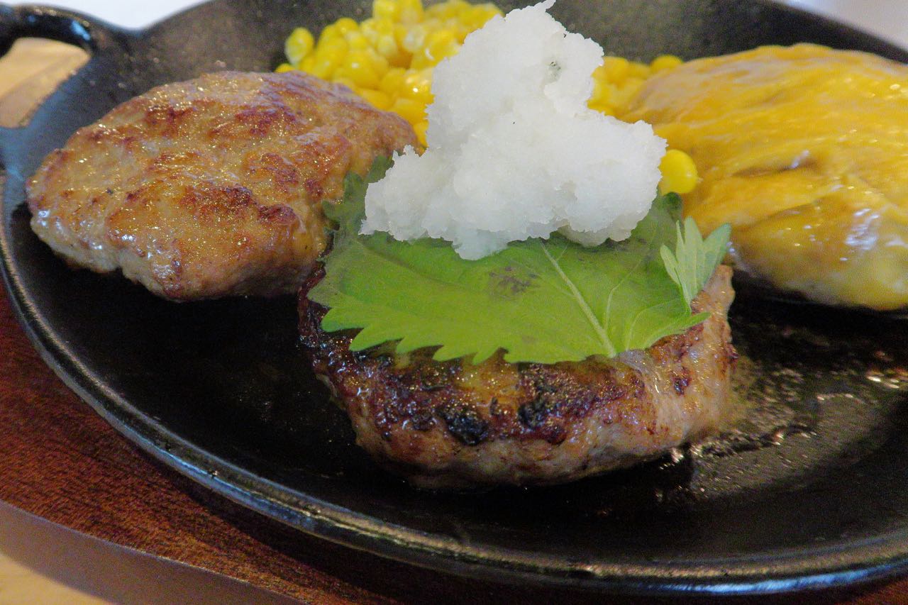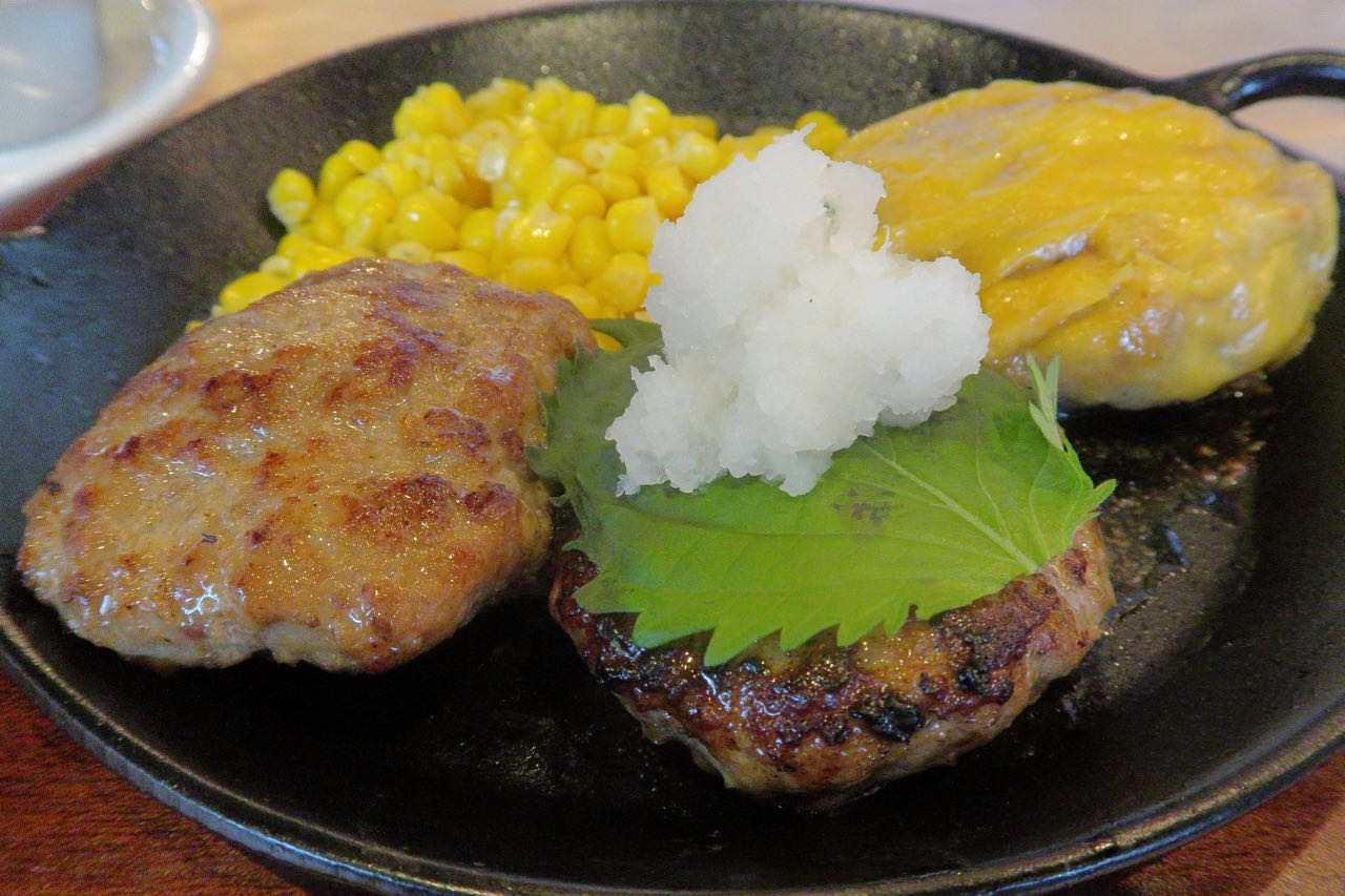 注文したのは "ブッチャーズハンバーググリル" で、3種類のハンバーグがのっている。プレーン、チーズ、和風おろしといったところか。正確な数字はわからないけど、確か全部で 300g を超えてたと思う。ハンバーグに合わせてソースも小皿で3種類用意されていて、自分でかけて食べる。一度に3種類を味わえるので、どれにしようかと悩まなくて すむのがいい。 ^^;