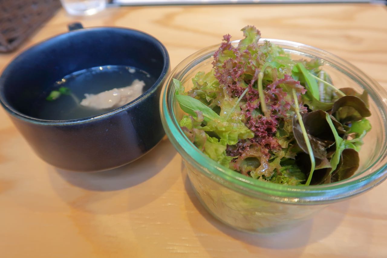 柔らかくなった牛すじの入ったカップスープとサラダ。