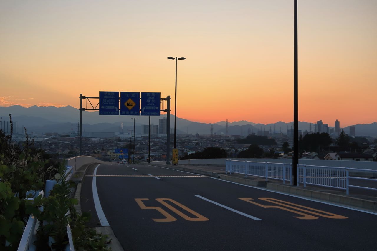 オレンジに染まった空が美しい。あと 10 分ほど早く着いていれば、山に差し掛かる西日が撮れたかも…って感じの色合い。