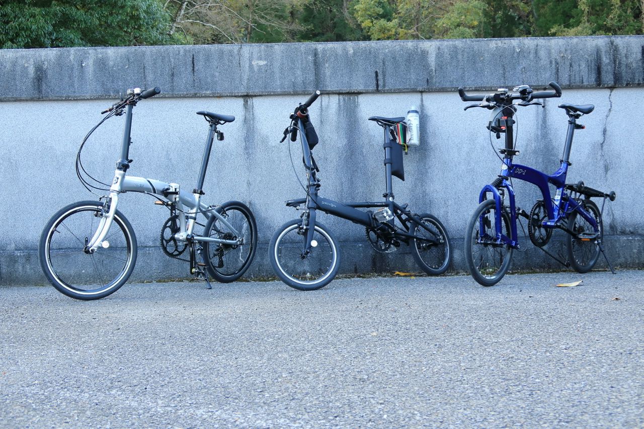 ここで今回の3台をご紹介。左から DAHON Mu SLX, DAHON Presto SL, bd-1 だ。私だけシングルギアで、私だけスタンドが付いてない。 ^^;