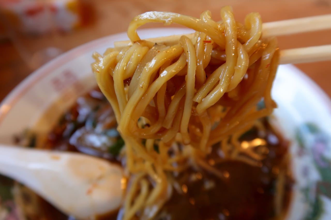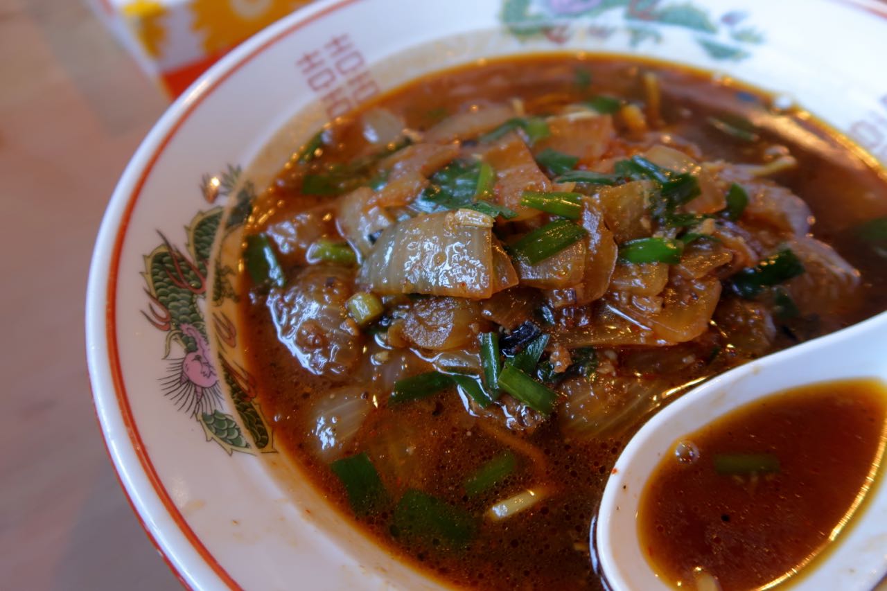 でも、チャーシューがのってない分、特徴が浮き上がっているとも言える。玉ねぎ、にら、ニンニクがたっぷりで、とっても濃い味わいなのだ。少しばかり唐辛子の辛味もあるかな。