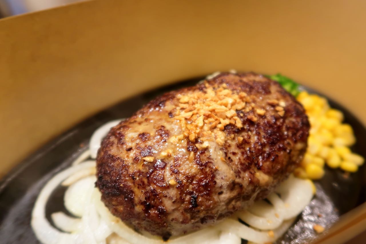 運ばれてきた 300g のハンバーグ (通常は 200g) は、鉄板から肉汁が飛び散らないように、周りが紙で囲われている。
