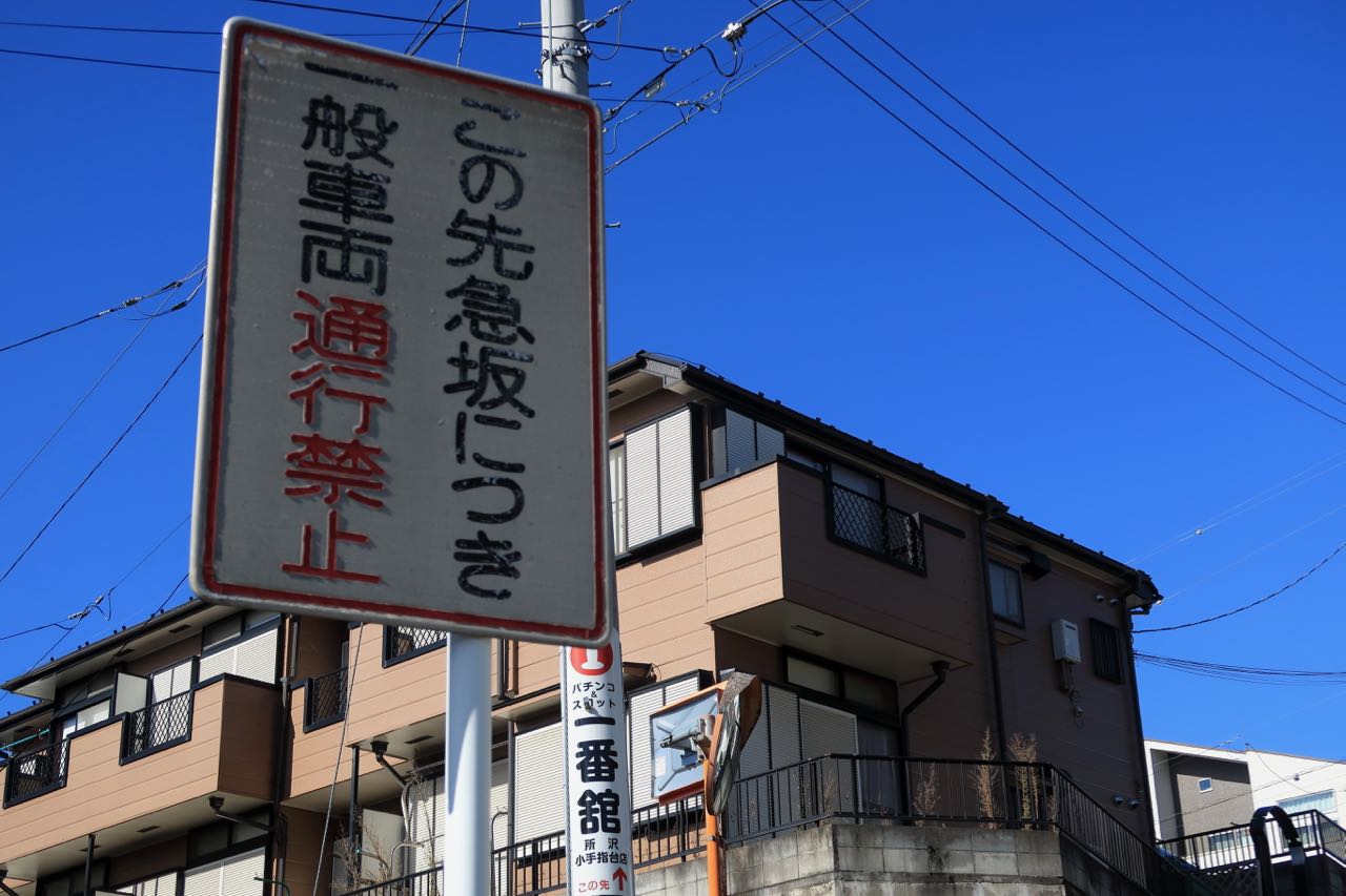 多摩湖を過ぎて住宅地を走ると、こんな看板が…。 ^^; 距離は短くて 100m ほどなんだけど、斜度はえげつない。写真を撮って上ろうとしたのだけど、クリートをキャッチできずに挫折。 (><) ロードバイクを押し歩きながら斜度計を確認すると、 20% ほどだった。 ^^;