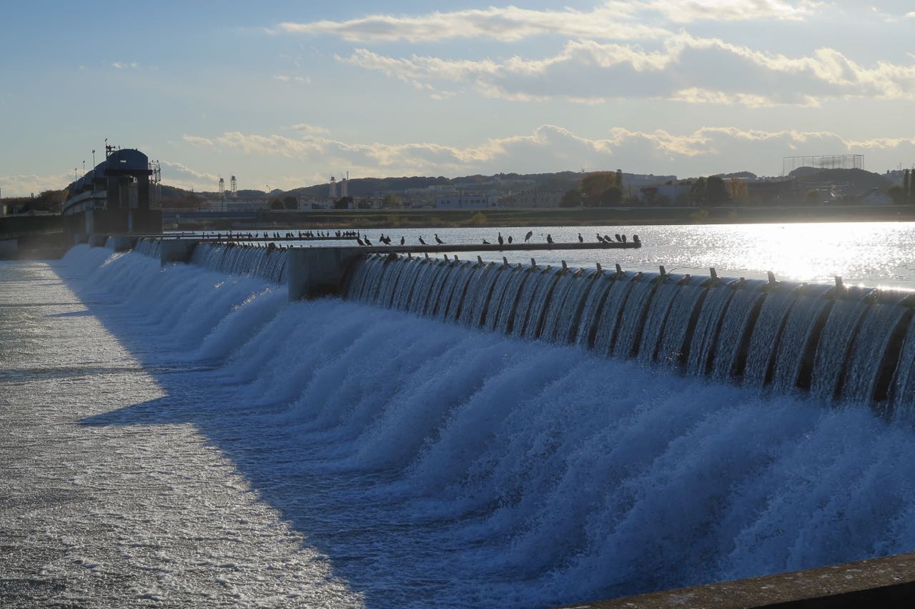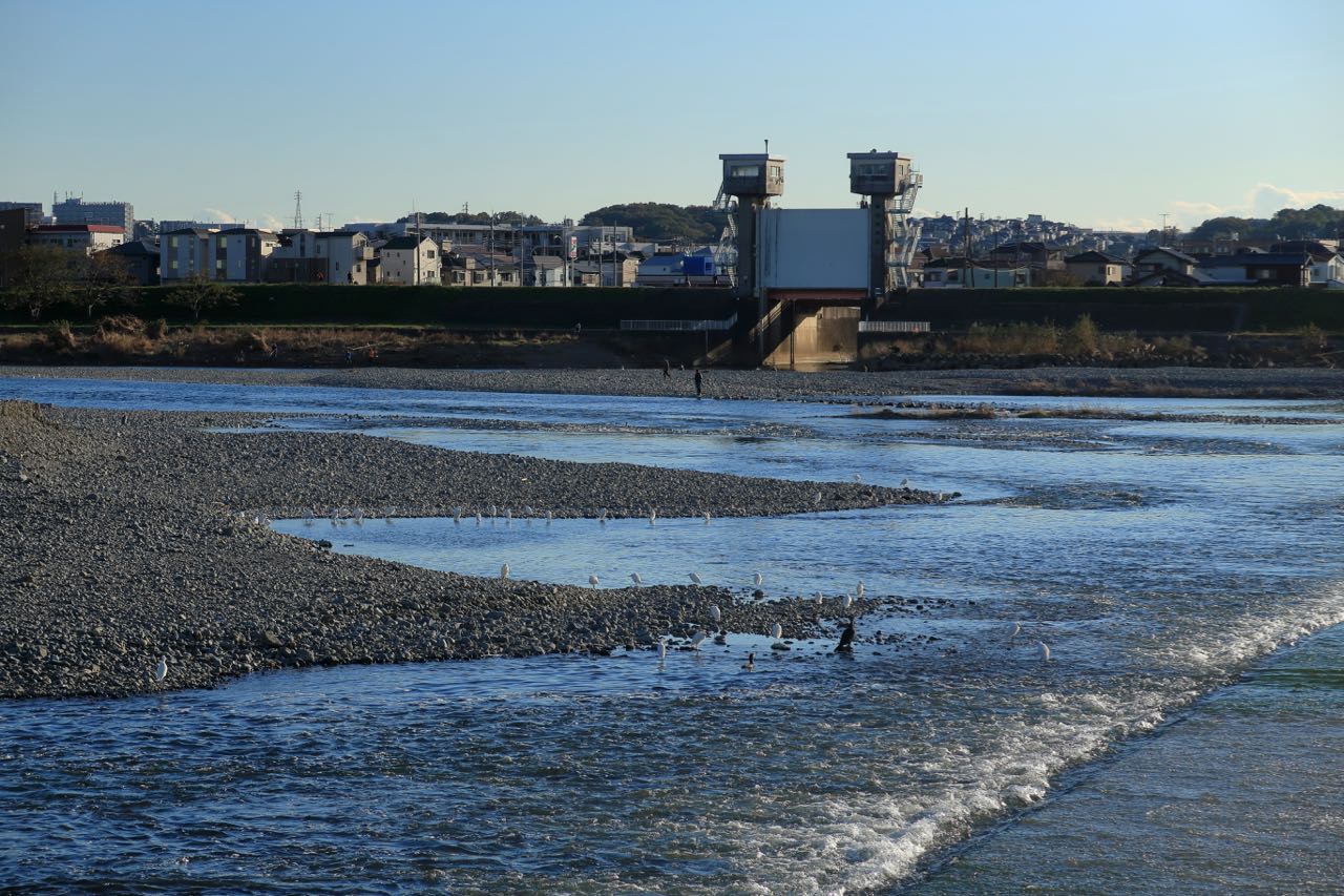 いつもは土手の上から見てて気付かなかったけど、めっちゃ鳥がいる〜! 堰を越えてきた魚を食べるのに、ちょうどいい場所なのだろう。