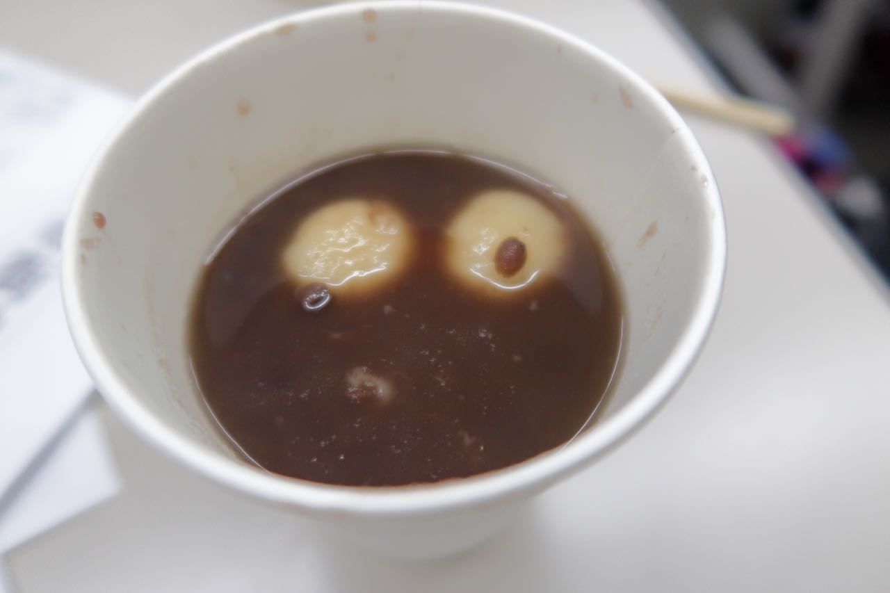 待ち時間に配られたぜんざい。甘くて、あったかくて、めっちゃ美味しい。 ^^ 白玉の他に栗も入ってた。まさか、こんな用意までしてくださっていたとは…。ぜんぜん、お試しレベルぢゃない運営だわ、これは。