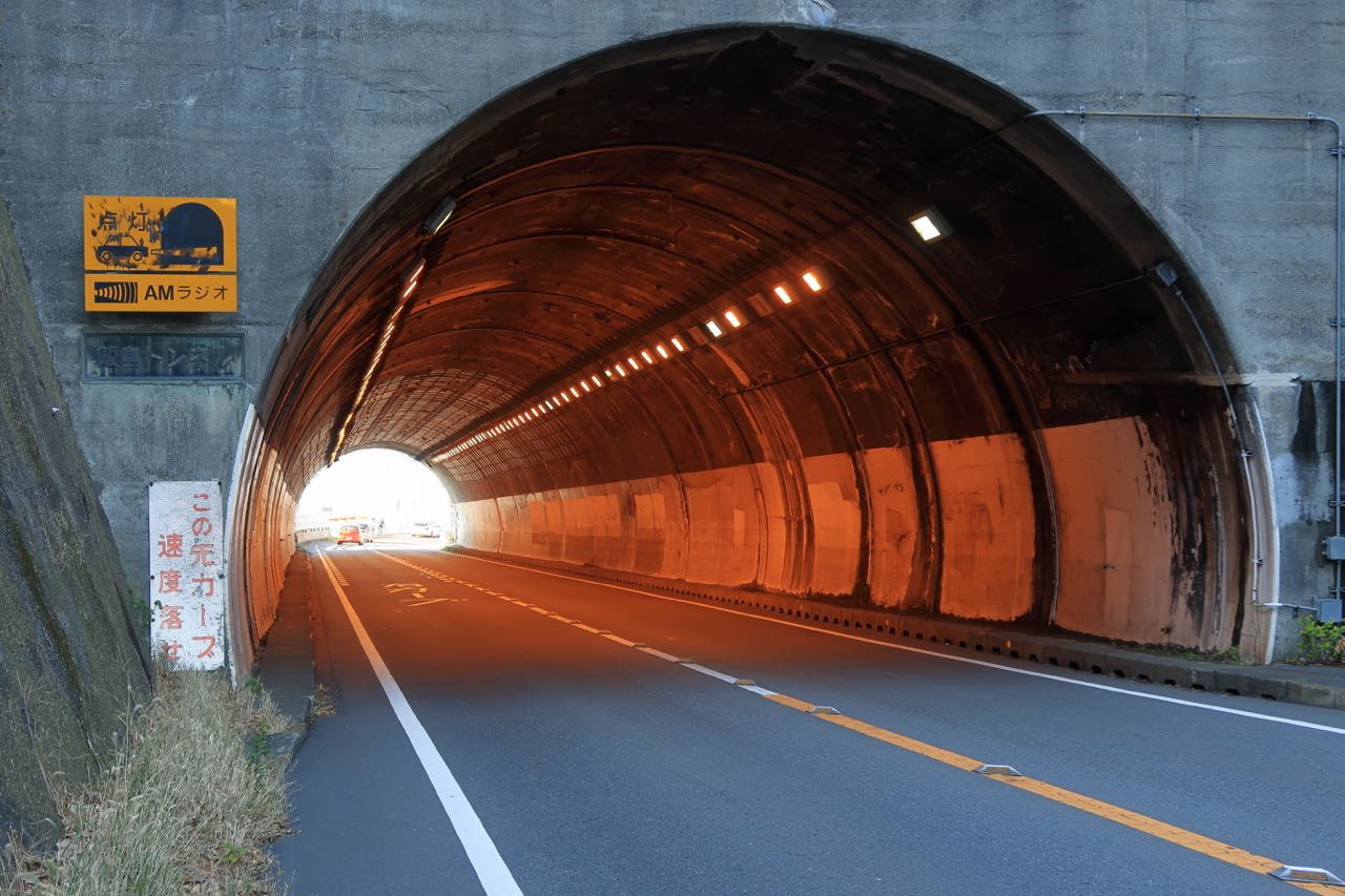 トンネルはやや下り坂になっていて、向こう側には海が見えたので頑張って撮ったのだけど、写真だと光って何も見えなかった。残念…。