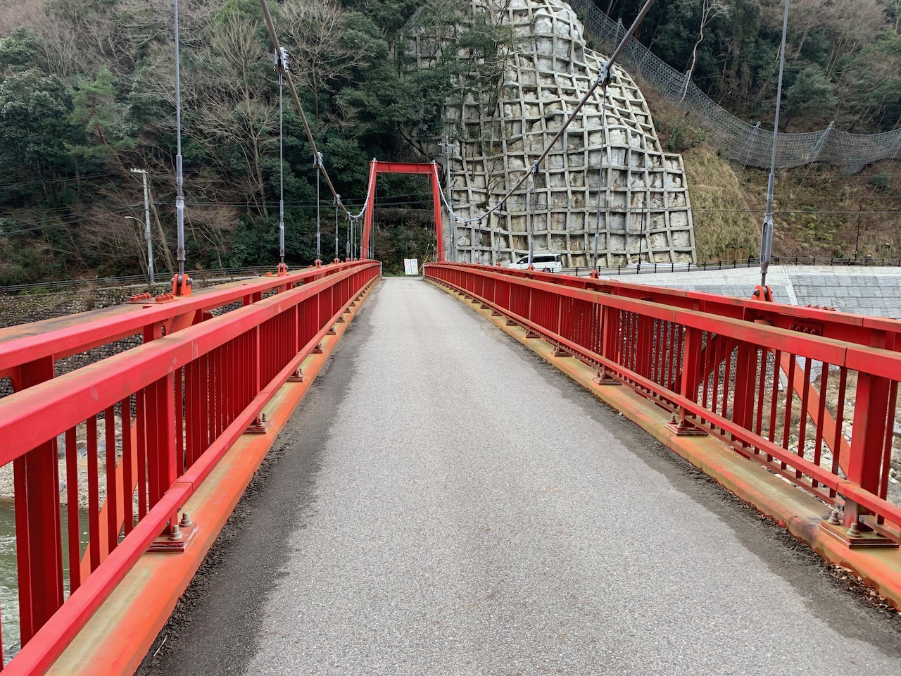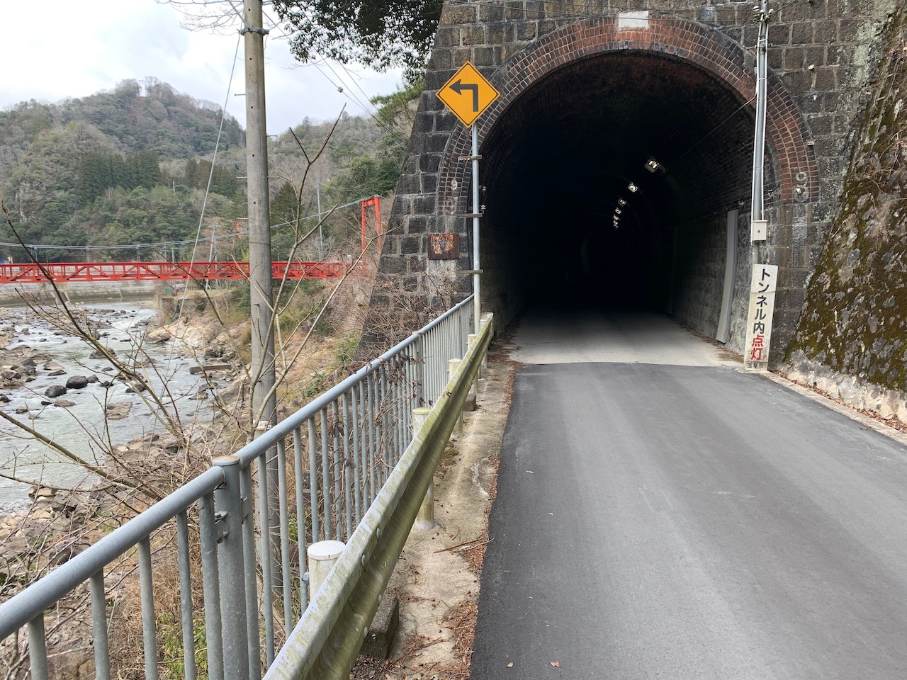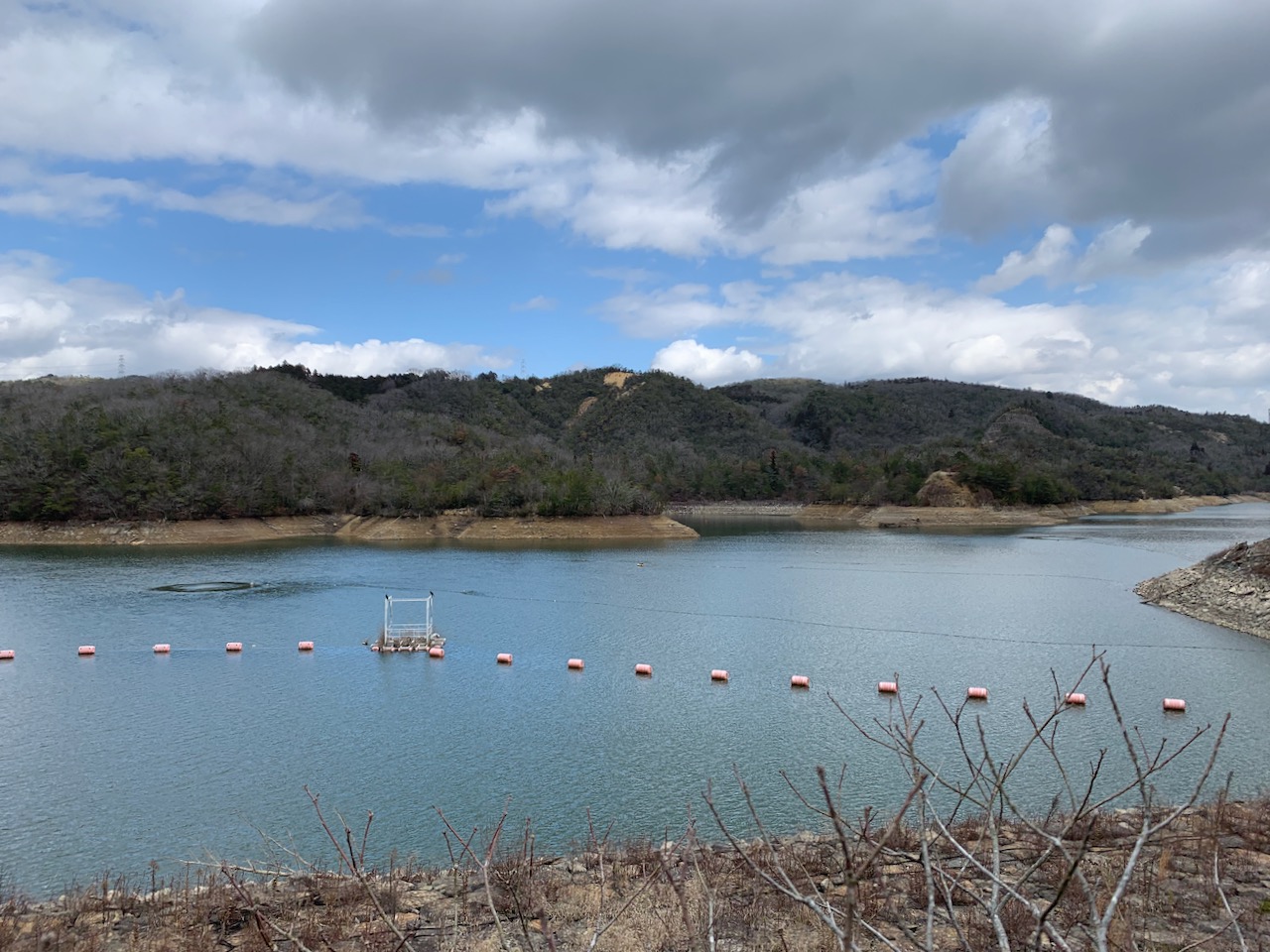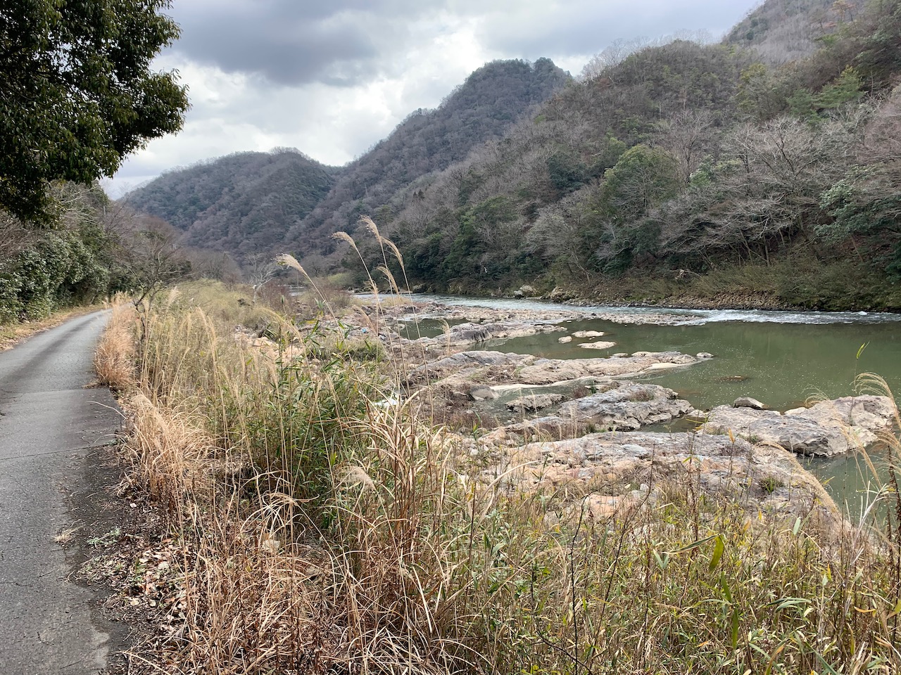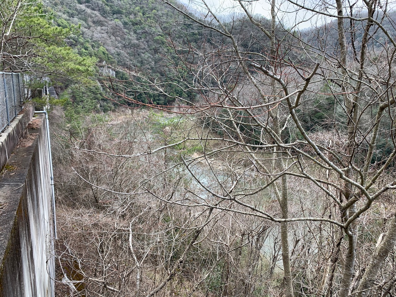 ここが謎解きの本丸なんだけど、いい写真が撮れない! (><) 写真左側に川下川ダムからの川があるんだけど写ってない…。右側から来たのと合流して、奥へ向かって流れているポイントだ。立ち入り禁止のところへ入れば、もうちょっと分かりやすいのが撮れるはずなんだが…。