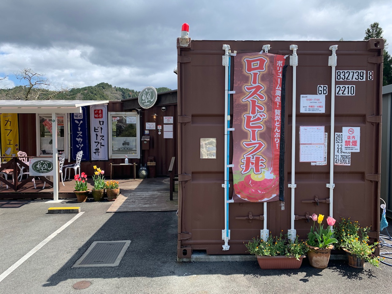 コンテナを組み合わせた個性的な外観。ローストビーフ丼のノボリが風になびく。